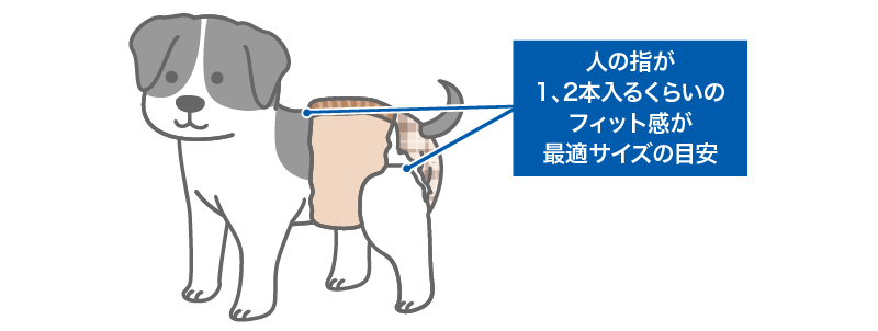 実際に装着して、ワンちゃんの体に合っているかどうかを確認するには、肌とおむつが当たる「おなかまわり」「足まわり」に、人の指が1、2本入るくらいのフィット感が目安です。ワンちゃんが歩きにくそうにしていないか、排泄物がモレないかも確認してください。