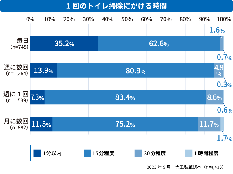 続いて、「1回のトイレ掃除に掛ける時間」について聞いてみたところ、お掃除の頻度にかかわらず「15分程度」という方が最も多い結果に。ですが、2番目に多かった答えは、トイレ掃除の頻度が「毎日」「週に数回」の方は「1分以内」、掃除頻度が「週に1回」「月に数回」の方は「30分程度」と、異なる結果となりました。