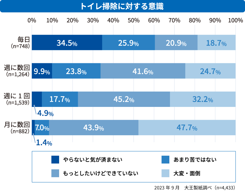最後に、皆さんのトイレ掃除に対する意識を聞いてみると、トイレ掃除の頻度が多い方ほど「やらないと気が済まない」「あまり苦ではない」という方が多く、お掃除の頻度が下がるにつれ「大変・面倒」という方が増えていくことがわかりました。
