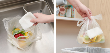拭き掃除後のシートを、生ゴミを捨てるゴミ袋に一緒に入れて密閉し、ゴミ箱に捨てる。