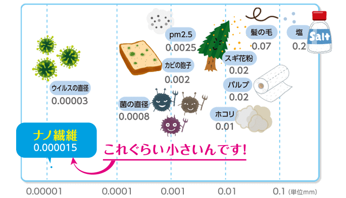 - 髪の毛の5千分の1から1万分の1程度の太さの極細繊維。