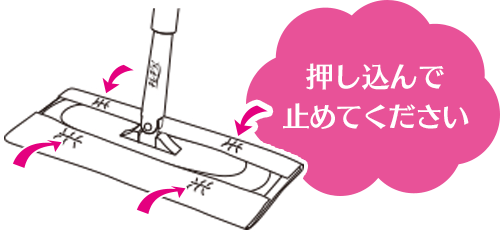 「キレキラ!ワイパー」の柄がゆるんでいないことを確認してください。シートの中心に「キレキラ!ワイパー」を置いて、ヘッドを包み込むようにして、4ヶ所のツメ部(差し込み口)に押し込んで止めてください。