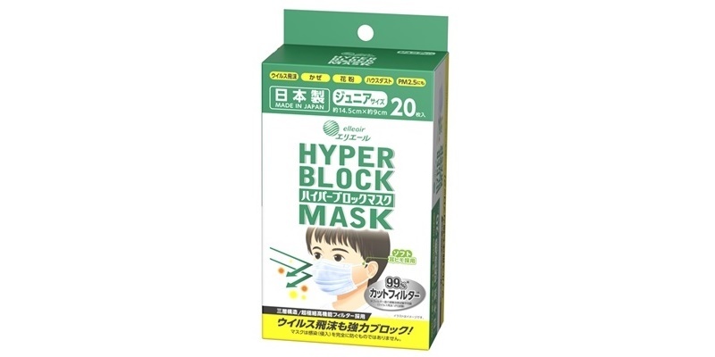 「ハイパーブロックマスク ジュニアサイズ」は、極細繊維のメルトブローン不織布を使用した、高機能フィルターを採用しているのが特長。太くてやわらかい耳ゴムと、快適ワイヤー(マウスバー)&立体プリーツ構造で、口元に呼吸しやすい空間を作ります。ジュニアサイズのみを展開しています。