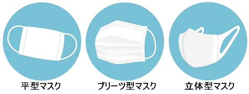 自分に合ったマスクのサイズが判明したところで、マスクの種類とその違いについてご説明しましょう。マスクの形は大きく3つに分けられます。長方形の形をした「平型マスク」と、スカートのように立体的なプリーツ(ひだ)加工を施した「プリーツ型マスク」、そして人の顔のラインに沿った形の「立体型マスク」です。