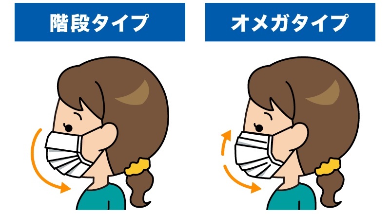 プリーツ型の場合、ノーズフィッターのワイヤーがあるほうが上になります。また、プリーツが同じ向きに折られた「階段タイプ」のプリーツ型マスクは、広げたときにプリーツの段が下向きになる面が表側です。なお、真ん中から上下に引き延ばす「オメガタイプ」のプリーツ型マスクは、広げたときに凸型になる面が表側になります 。