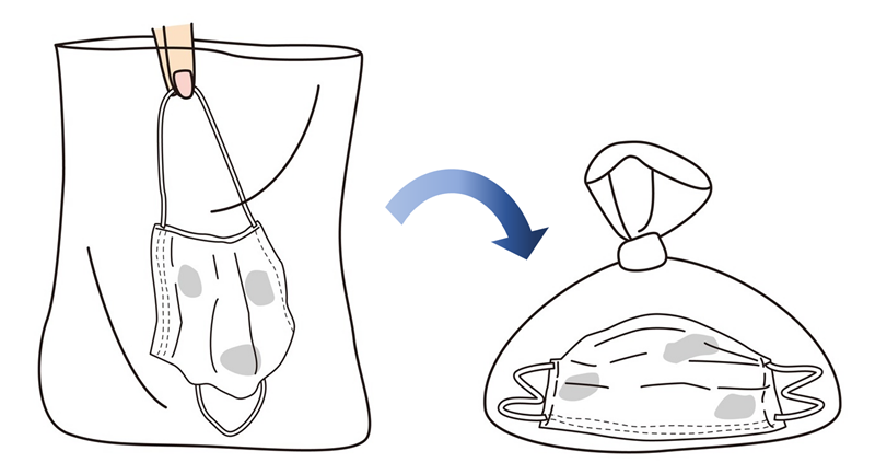 使用後のマスクを捨てるときは、まずマスク本体にさわらないよう、耳掛け部分 を持ってそっとマスクを外します。その後はビニール袋に入れて、しっかりと口をしばって密閉してから、お住まいの地域のルールに従ってゴミに出しましょう。なお、マスクを捨てた後は、石鹸などで念入りに手を洗ってください。
