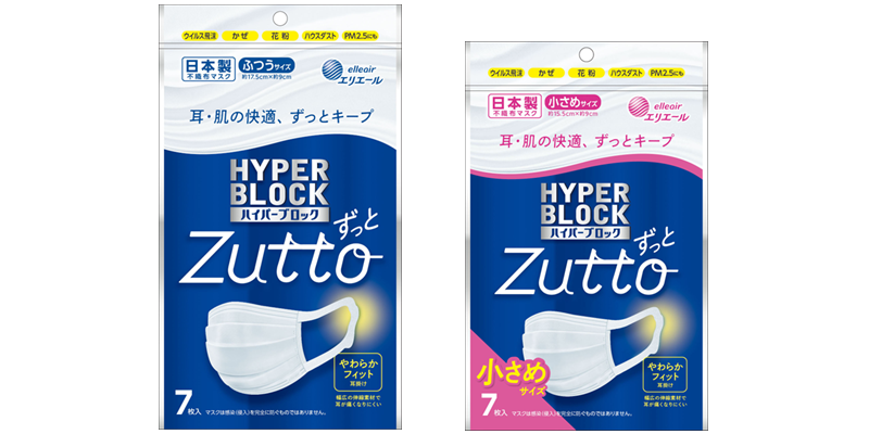 「ハイパーブロックマスク Zutto」は、しっかりと厚みのある不織布を使用し、毛羽立ちにくく型崩れしにくいのが特長です。耳掛け部分には従来品の約1.5倍の厚みを持つ不織布を採用。すっきりとした頬周りのデザインもポイントです。ふつうサイズと小さめサイズをラインナップしています。