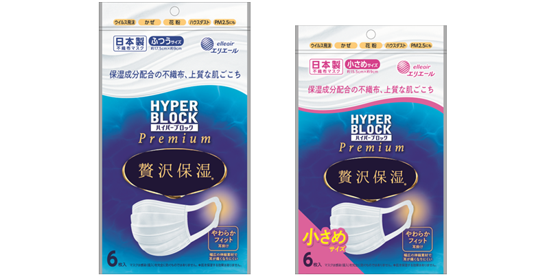 「ハイパーブロックマスク 贅沢保湿」は、ふんわりした厚み感があり、肌あたりの良い不織布を採用しています。さらに、肌にあたる内側不織布には、「エリエール 贅沢保湿ティシュー」をベースとした保湿成分を塗布。しっとりなめらかで上質な肌ざわりが人気です。ふつうサイズと小さめサイズをラインナップしています。