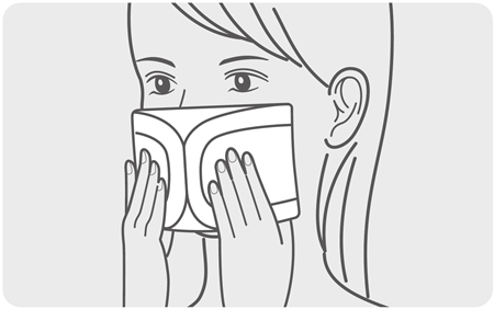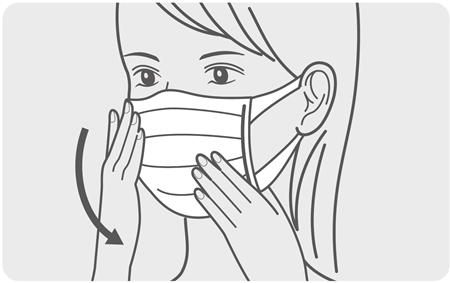 プリーツ型の場合、ノーズフィッターを鼻筋に合わせて曲げ、マスクの隙間をなくすほか、頬や顎の部分に隙間ができないよう、プリーツをきちんと広げて調整します。マスクを顔に密着させることが重要です。