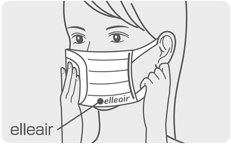 マスクには表と裏があります。「ハイパーブロックマスク」の場合は、「elleair」マークがマスク本体の左下になる面を外側にして、マスクを口にあててください。
