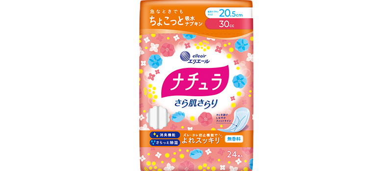 「よれスッキリ吸水ナプキン」は、ズレ・ヨレ防止機能を備え、万が一の尿モレをきちんとキャッチできるのが特長。吸水後もさらさら感が持続するほか、ムレにくく、気になるニオイもケアします。「ちょこっとケア」の用途に適したタイプは、吸収量が30~65ccとなっています。