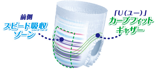 | 素材 | 表面材:ポリオレフィン系不織布 吸水材:綿状パルプ、高分子吸水材 吸収紙:ポリオレフィン系不織布 防水材:ポリオレフィン系フィルム 止着材:ポリオレフィン系フィルム 伸縮材:ポリウレタン 結合材:スチレン系合成樹脂 等 |