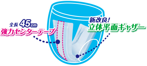 外折りの立体平面ギャザーが足まわりにフィット。寝返り時のすきまモレにも安心です。