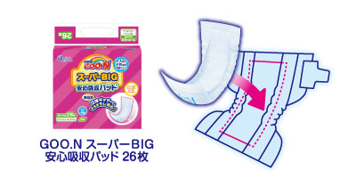 「スーパーBIG安心吸収パッド」とのセット使いで、さらにすきまモレを軽減します。