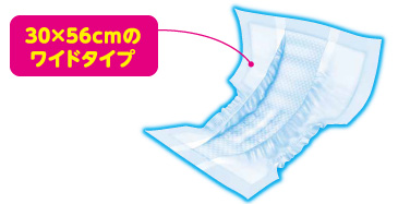 おしりを包み込む安心のワイドタイプ。広い面積で吸収するから背中からのモレに安心。