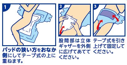 | 素材 | 表面材:ポリオレフィン系不織布 吸水材:綿状パルプ、吸収紙、高分子吸水材 防水材:ポリエチレンフィルム 止着材:スチレン系エラストマー合成樹脂材 伸縮材:ポリウレタン 結合材:スチレン系エラストマー合成樹脂材 外装材:ポリエチレン |