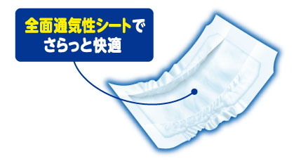 一晩中ムレにくい布感覚の全面通気性シート採用でスキントラブルを軽減。くり返し吸収しても表面はさらさら、ベタつきません。