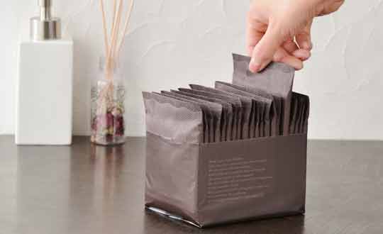 パッケージを開けると落ち着いた色味の個包装。ナプキン自体のバックシートのデザインもなくし、中身が透けにくいブラウンの不織布で包みました。自宅での保管や持ち歩くときも、新しいブラウンの個包装が気分を変えてくれるかもしれません。