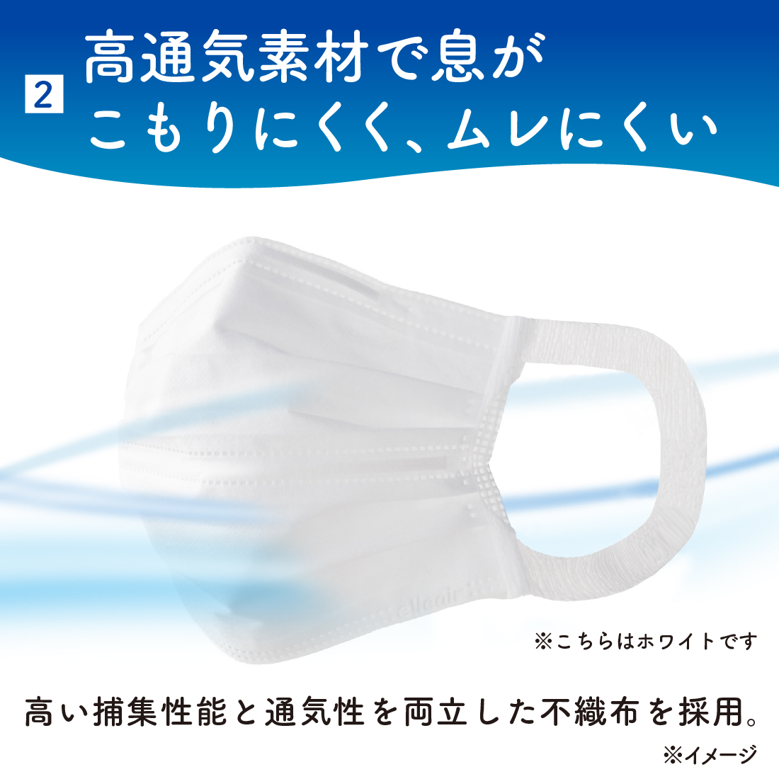 不織布3層構造の高機能フィルター採用で、ウイルス飛沫、かぜ、花粉、ハウスダスト、PM2.5の侵入を防ぎます。