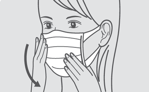 マスクを片手で押さえ、耳掛け部分を耳に掛けます。反対側も同様にします。