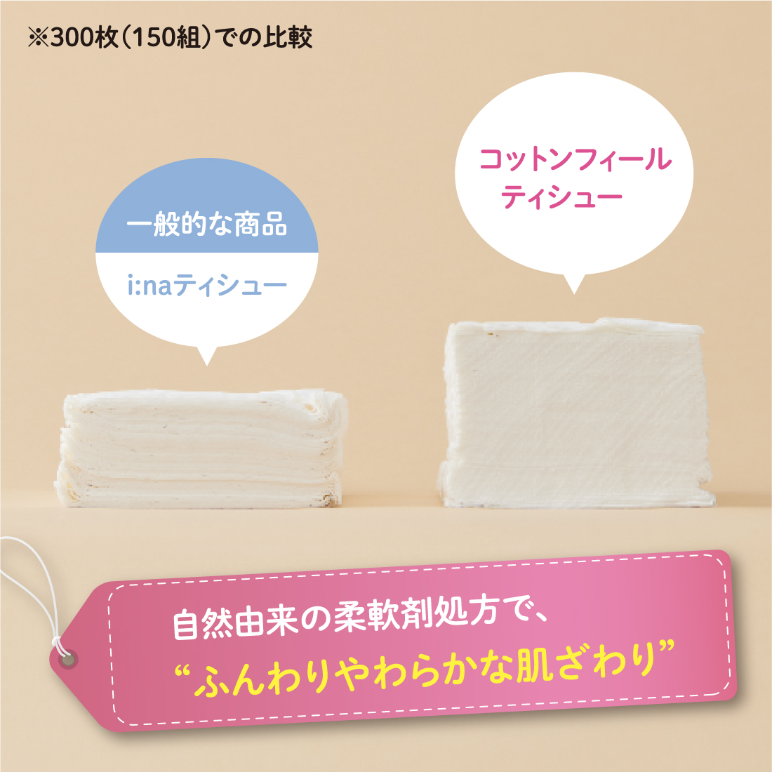 自然由来の柔軟剤を配合する技術の改良によって、パルプ繊維に柔軟剤がなじみやすくなり、従来品に比べてふんわり感が1.9倍※1、やわらかさが1.1倍※2向上しました。