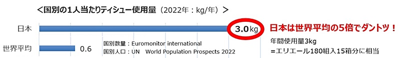 世界と日本で、1人あたりのティシューペーパーの年間使用量を比べてみると、世界平均が0.6kgなのに対し、日本は3.0kg。実に、世界平均の約5倍の量を毎年使用していることになります。