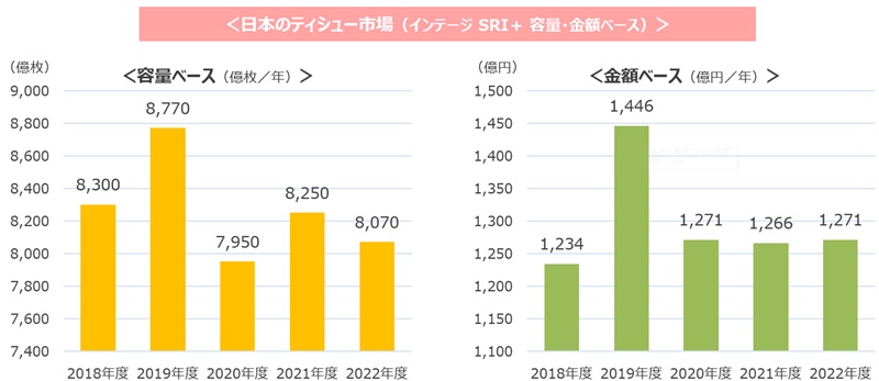 日本のティシュー市場は現在、容量ベース年間で8,000億枚以上、金額ベースでは年間約1,200億円を上回っています(2019年度は新型コロナ禍によって需要が急増)。