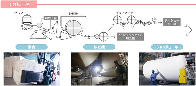 製紙工程では、パルプを「パルパー」という機械に入れて繊維をほぐし、商品ごとの特性に合わせて調合を行います。調整された液状の原料は、「抄紙機」という機械でワイヤー(網)上に均一に噴射された後、瞬時に乾燥させて紙になります。