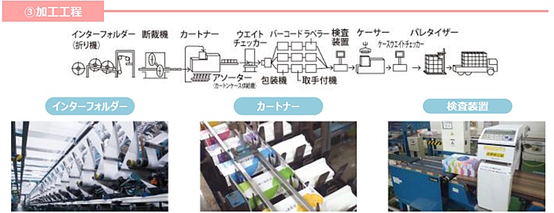 加工工程では、ジャンボロールを「インターフォルダー」という設備に通し、紙が1枚ずつ取り出せるように、高速で折りたたみながら積み重ねます。その後、規定のサイズにカットした紙を、「カートナー」という設備で箱詰めします。