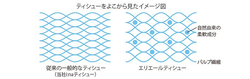 「エリエール」は長年、研究と品質改良を重ねてティシューのやわらかさを追求してきた結果、2008年に柔軟剤処方による独自製法を開発。柔軟成分で繊維1本1本をコーティングすることで、きめ細やかでなめらかな感触を実現しました。