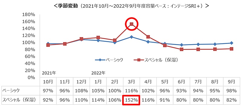 保湿ティシューを含むスペシャルティシューの需要が伸び始めるのは、風邪やインフルエンザの流行が始まる12月頃。さらに、花粉の飛散が本格化する3月には、需要を示す季節変動指数(容量ベース)は通年平均の152%にまで到達します。