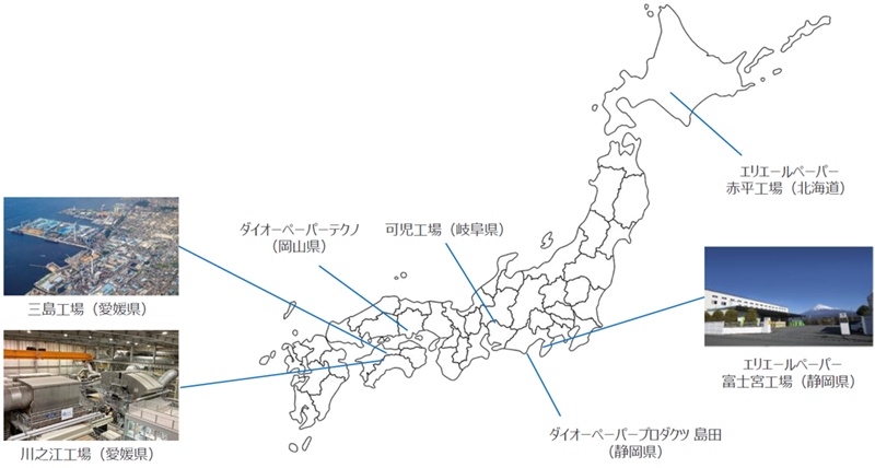 大王製紙グループは、北海道から四国まで全国6ヵ所の生産拠点で、国内需要の20%相当を生産しています。その中でも、自然の立地を活かしてパルプから一貫して生産する三島/川之江工場と、一大消費地である首都圏に近いエリエールペーパー富士宮工場が主力の工場となっています。